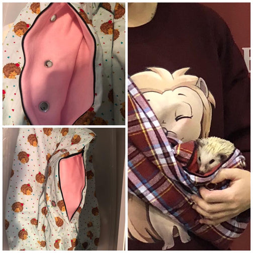 Personally, my favourite out of all the fabric items I carry. I use this all the time for bonding / traveling with my hedgehogs. Can be used to carry them around the house or anywhere else. The pouch is made with fleece to keep them extra warm and toasty with a zipper so they don’t climb out and there’s grommets on the sides for air ventilation. Hedgehogs love it. They sleep inside comfortably and they feel your human’s heartbeat cuddled like a baby.