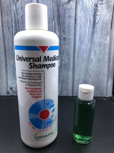 Universal Medicated Shampoo is an antiseptic shampoo that may be used as an adjunctive therapy for the most common dermatological conditions in dogs and cats. It provides antibacterial, antifungal, and deodorizing action. Comes in 1oz. 2oz and 8oz glass bottles.